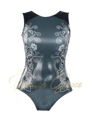 A sleeveless leotard with filigree patterning down each side of the torso. Available in a selection of colours.