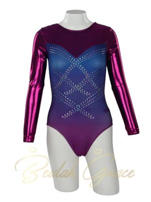 Vibrant coloured long-sleeve leotard. Crossed pattern in silver sequins adorns the front torso.
