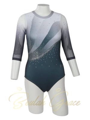 A long sleeved leotard with mesh sleeves and crystals covering a large portion of the leotard.