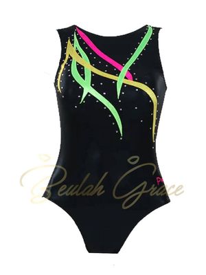 Black tank style leotard with multi colour design.