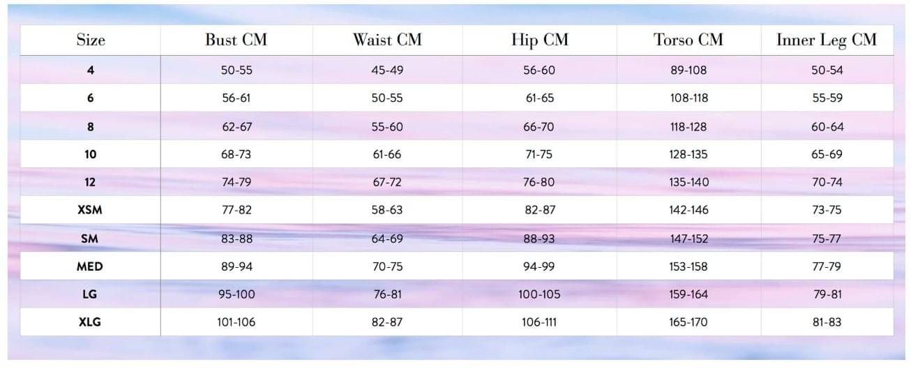 All of our leotards are produced in the same place, so sizing is quite consistent.